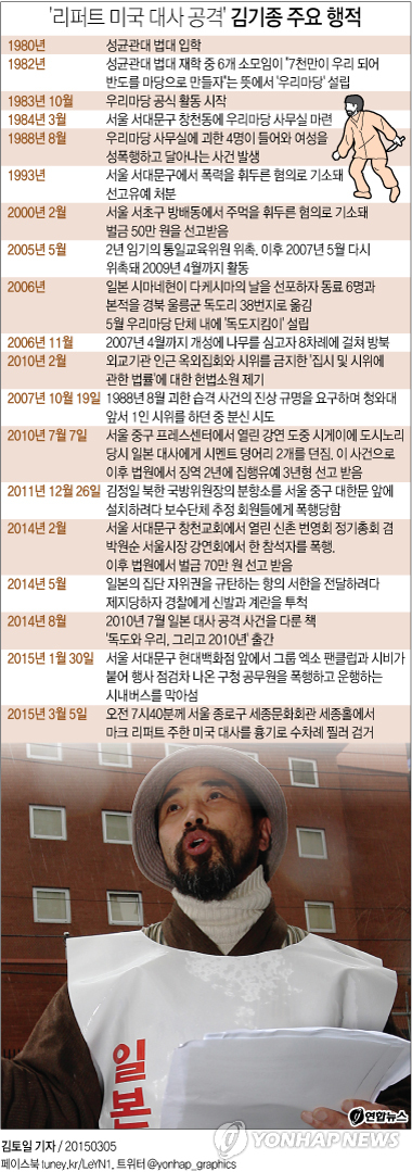 | △ <그래픽> '리퍼트 미국 대사 공격' 김기종 주요 행적 (서울=연합뉴스) 김토일 기자 = 마크 리퍼트 미국 대사에게 흉기 공격을 해 검거된 우리마당독도지킴이 김기종 대표(55)는 과거에 일본 규탄 관련 활동을 왕성하게 하다가 최근 들어 미국을 정조준했던 것으로 나타났다. kmtoil@yna.co.kr 페이스북 tuney.kr/LeYN1 트위터 @yonhap_graphics |