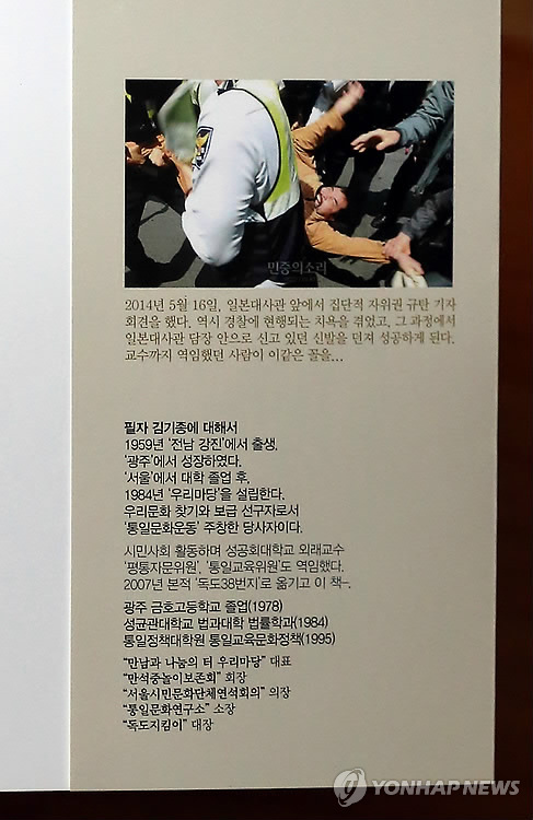 또 지난해 5월 일본의 집단적 자위권 행사 규탄 기자회견 중 일본대사관 담장 안에 신발을 던진 사건에 대해 책 날개에 '성공했다'는 문구를 쓰기도 했다.