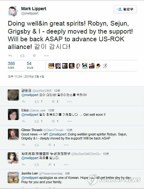 (서울-연합뉴스) 황철환 기자 = 마크 리퍼트 주한 미국대사의 트위터에 응원과 위로의 댓글이 이어지고 있다.