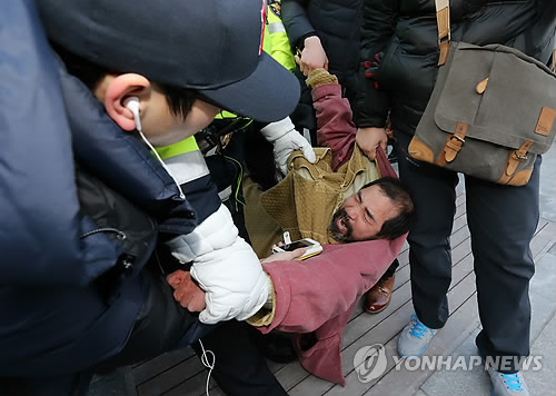 | △ 경찰차로 이송되는 김기종 (서울=연합뉴스) 윤동진 기자 = 지난 5일 오전 서울 세종문화회관에서 열린 민화협 주최 초청 강연에서 마크 리퍼트 주한 미국대사를 습격한 김기종씨가 경찰차로 이송되고 있다. |