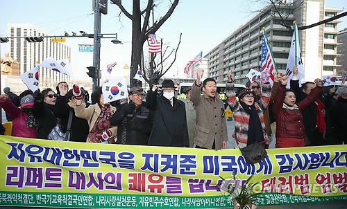 이어 "우리는 미국 대사의 쾌유를 빈다"면서 우리 정부에 "이번 '반미테러'를 계기로 평화통일과 민족자주라는 가면을 쓰고 북한을 비호하는 종북반미 세력을 척결해달라"고 촉구했다.