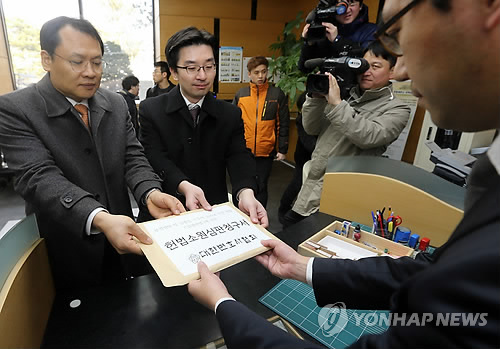 | △ 대한변호사협회 강신업 홍보이사(왼쪽)와 채명성 법제이사가 부정청탁 및 금품등 수수의 금지에관한 법률(김영란법)에 관한 헌법소원심판청구서를 5일 서울 헌법재판소 민원실에 제출하고 있다. |