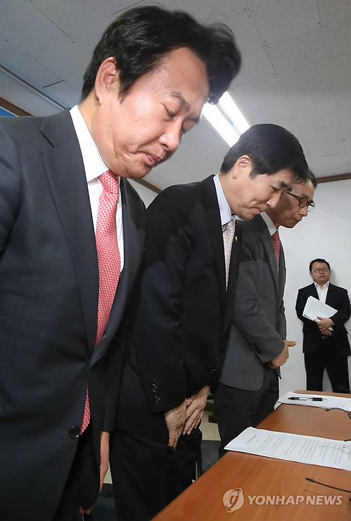 | △ 사과하는 민화협 관계자들 (서울=연합뉴스) 김도훈 기자 = 5일 오후 서울 종로구 민족화해협력범국민협의회에서 관계자들이 오전 발생한 마크 리퍼트 주한 미국대사의 습격 사건에 대해 대국민사과를 하고 있다. 왼쪽부터 이성헌 상임집행위원장, 장윤석 공동 상임의장 겸 새누리당 의원, 김영만 홍보위원장.2015.3.5 superdoo82@yna.co.kr |