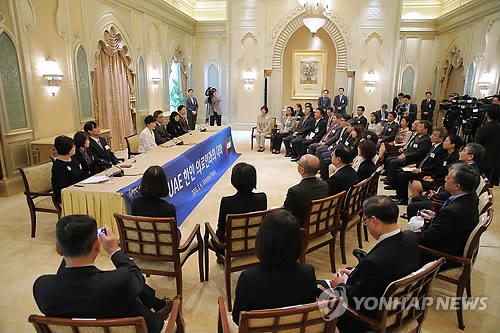 △ 박 대통령, UAE 한인 의료인 간담회 (아부다비=연합뉴스) 이정훈 기자 = 박근혜 대통령이 6일 오후(현지시간) 아랍에미리트(UAE) 아부다비 한 호텔에서 UAE 한인 의료인과 간담회를 갖고 있다.