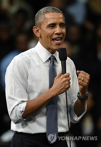 △ '사회 참여' 강조하는 오바마 (AP=연합뉴스) 버락 오바마 미국 대통령이 6일(현지시간) 사우스캐롤라이나주 컬럼비아에서 열린 타운홀 미팅에 참석해 사회 참여의 중요성을 역설하고 있다.