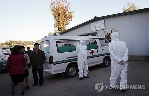 | △ 서아프리카 여행객이 들어왔나? (AP=연합뉴스) 27일(현지시간) 북한 평양 순안국제공항 식당 옆에서 방호복을 입은 의료진이 구급차를 대동하고 누군가를 기다리고 있다. 북한은 지난주부터 외국인 여행객의 입국을 금지하는 등 에볼라 바이러스 유입을 막기 위한 강력한 대응책을 마련한 것으로 알려졌다. marshal@yna.co.kr Medical staff are dressed in protective suits as they wait by an ambulance, at the Sunan International Airport, Monday, Oct. 27, 2014 in Pyongyang, North Korea. North Korea last week stepped up its measures to prevent the spread of the Ebola virus while a major travel agency that specializes in tours to the reclusive country said it had been informed Pyongyang may ban foreign tourists from visiting.(AP Photo/Wong Maye-E) |