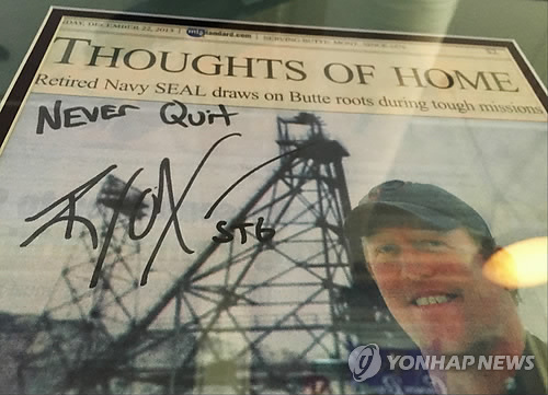 | △ "내가 빈 라덴을 쏘았다" (AP=연합뉴스) 9·11 테러 주범 오사마 빈 라덴을 직접 사살했다는 미국 해군특전단(네이비실) 예비역 상사 로버트 오닐의 인터뷰를 다룬 워싱턴포스트 기사가 6일(현지시간) 몬태나주 뷰트의 한 스포츠바 벽에 붙어 있다. 오닐의 사인도 보인다. 뷰트 출신인 오닐은 이날 워싱턴포스트와의 인터뷰에서 2011년 5월 네이비실 최정예 '팀6'의 일원으로 파키스탄 아보타바드의 빈 라덴 은신처를 급습했을 때 자신이 빈 라덴의 머리에 두 발의 총알을 쐈으며 그가 쓰러진 뒤 한 발을 더 쐈다며 첫 발이 이마에 맞았기 때문에 빈 라덴이 즉사했을 것이라고 생각했다고 말했다. marshal@yna.co.kr A framed Montana Standard newspaper article on Robert O'Neill of Butte, Mont., signed by O'Neill, is seen on the wall of the Metals Sports Bar in Butte on Thursday, Nov. 6, 2014. O'Neill, a Butte native and ex-Navy SEAL, told The Washington Post that he fired the shots that killed Osama bin Laden, a story he first recounted in February to Esquire magazine, which identified him only as "the shooter." One current and one former SEAL confirmed to The Associated Press that O'Neill was long known to have fired the fatal shots at the al-Qaida leader. The article is signed, "Never Quit." (AP Photo/Lisa Baumann) |