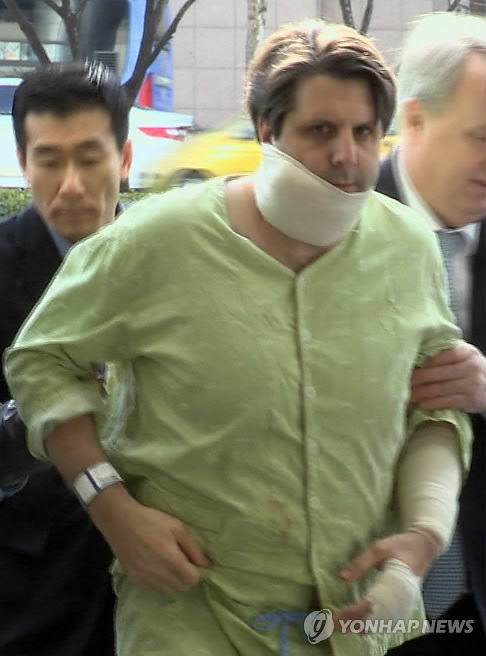 | △ (서울=연합뉴스) 5일 오전 흉기 습격을 당한 마크 리퍼트 주한 미국 대사가 서울 서대문구 신촌세브란스 병원으로 들어가고 있다. 2015.3.5 << 연합뉴스TV >> photo@yna.co.kr |