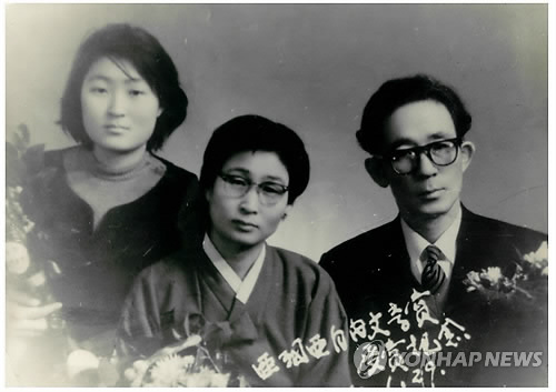 | △ 울산 오영수문학관 특별전…미공개 사진 공개 (울산=연합뉴스) 장영은 기자 = 울산시 울주군 오영수문학관이 개관 1주년을 맞아 오영수 선생의 특별전을 개최한다. 오는 28일부터 4월 26일까지 열리는 특별전에서는 오 선생의 데스마스크(망인의 얼굴을 본떠 만든 안면상)와 미공개 사진 등을 처음 전시한다.사진은 아세아자유문학상을 수상한 뒤 부인 김정선 여사와 큰 딸 오숙희씨와 함께 찍은 기념사진. 2015.3.8 << 오영수문학관 제공 >> young@yna.co.kr |