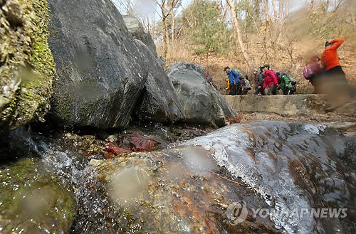 | △ 얼음이 녹으면 등산객이 온다 (서울=연합뉴스) 김도훈 기자 = 8일 오전 서울 서초구 청계산 골짜기의 얼음이 녹아 만들어진 개울 너머로 등산을 즐기는 시민들의 모습이 보인다. |