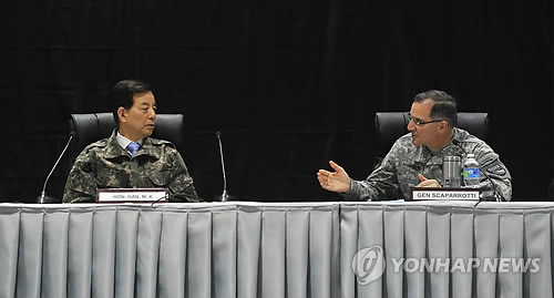 | △ 한민구 국방장관(왼쪽)이 6일 성남공군기지 미군시설 내의 키리졸브 훈련개념발전 예행연습 현장을 찾아 커티스 스캐퍼로티 한미연합사령관과 대화를 나누고 있다. |