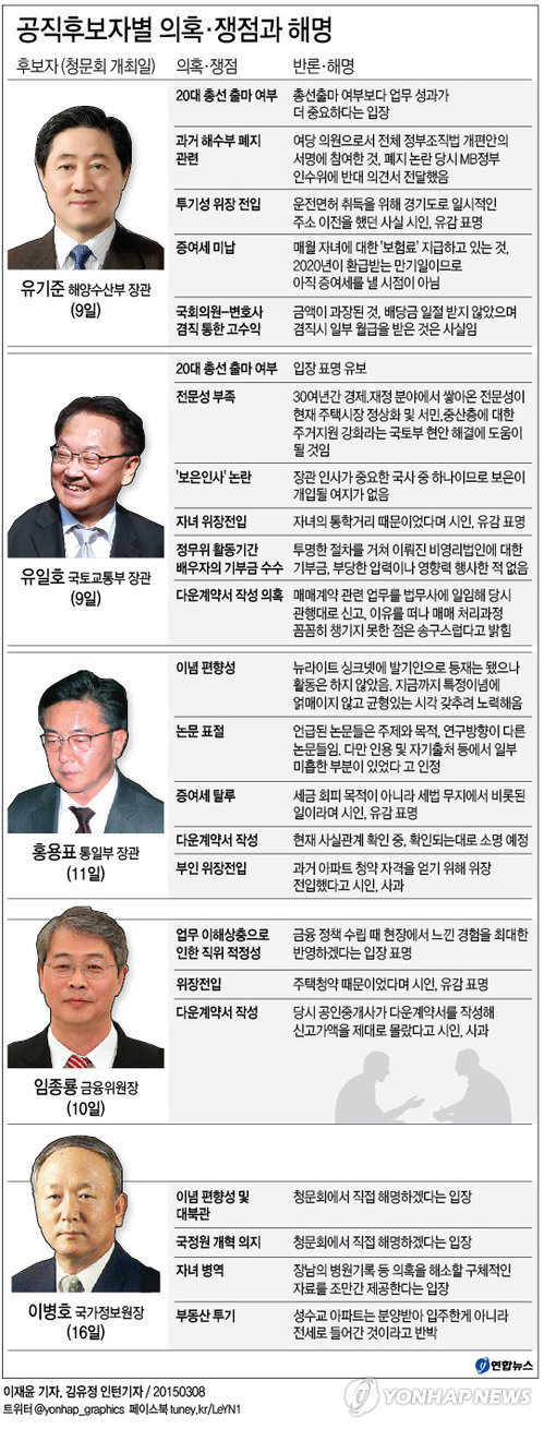 | △ <그래픽> 공직후보자별 의혹·쟁점과 해명 (서울=연합뉴스) 이재윤 기자 = 국회는 9일부터 20일 동안 최대 8개의 인사청문회를 개최할 예정이어서 여야간 전운이 감돌고 있다. 유기준 해양수산(9일) 유일호 국토해양(9일) 임종룡 금융위원장(10일) 홍용표 통일(11일) 장관 후보자 등 장관급만 4명에, 조용구 중앙선관위원(11일) 후보자와 이병호 국가정보원장(16일) 후보자의 청문회도 예정돼 있다. yoon2@yna.co.kr 페이스북 tuney.kr/LeYN1 트위터 @yonhap_graphics |