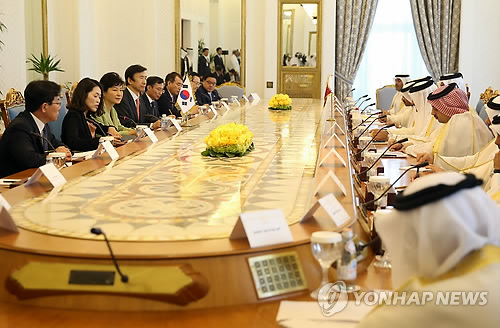 △ 한국-카타르 정상회담 (도하=연합뉴스) 도광환 기자 = 박근혜 대통령과 타밈 빈 하마드 알타니 카타르 국왕이 8일 오전(현지시간) 카타르 도하 에미리 디완 궁에서 정상회담을 하고 있다.