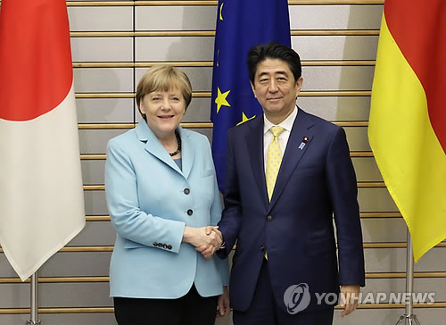 | △ 악수하는 아베 총리와 메르켈 총리(AP.연합뉴스) |