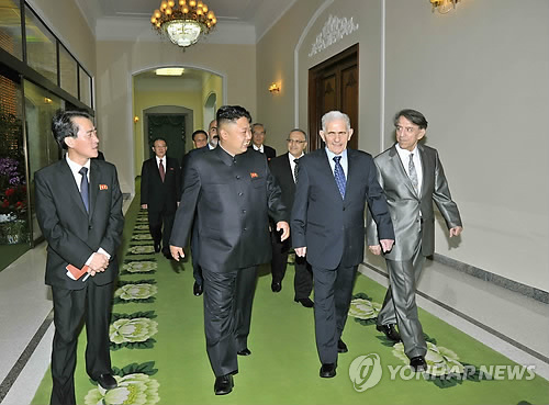 | △ 北 김정은, '전승절' 축하 시리아 대표단 접견 (평양 조선중앙통신=연합뉴스) 북한 김정은 국방위원회 제1위원장이 2013년 7월 '전승절'(7월 27일·정전협정 체결일) 기념행사에 참석하기 위해 북한을 방문한 시리아 대표단을 접견하고 있다고 조선중앙통신이 보도했다. 2013.7.25 photo@yna.co.kr |