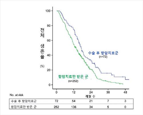 연구결과를 보면 대장의 악성종양을 수술로 떼어낸 뒤 항암치료를 받은 72명의 평균 생존 기간은 17.2개월이었다. 이 중에는 최장 4년 이상을 생존한 환자도 확인됐다. 반면 수술을 받지 않고 항암치료만 받은 252명의 평균 생존 기간은 상대적으로 짧은 13.6개월이었다.