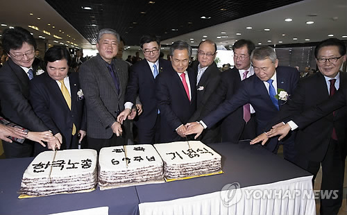 | △ 한국 노총 69주년 기념 떡 커팅 행사 (서울=연합뉴스) 윤동진 기자 = 10일 오후 서울 영등포구 여의도동 한국노총에서 열린 '한국노총 창립 69주년 기념식 및 후원의 날 행사'에서 김동만 한국노동조합총연맹 위원장(왼쪽 세번째), 유승민 새누리당 원내대표(왼쪽), 우윤근 새정치민주연합 원내대표(왼쪽 다섯 번째) 등 참석자들이 떡 커팅 행사를 하고 있다. 2015.3.10 mon@yna.co.kr |