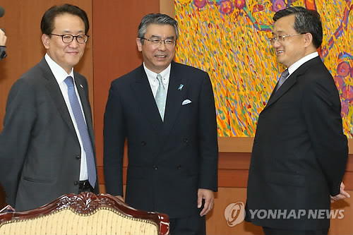 △ 한중일 3국 고위급 회담을 앞둔 지난해 9월 11일 서울 도렴동 외교부청사에서 각국 수석대표인 이경수 외교부 차관보(왼쪽부터), 스기야마 신스케 일본 외무성 외무심의관, 류전민 중국 외교부 부부장이 대화하고 있다. (연합뉴스 자료사진)