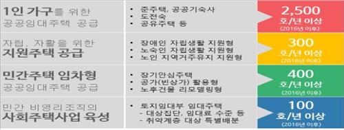 또 1인 가구를 위한 주택을 내년부터 연 2천500가구, 노숙인과 장애인을 위한 자립·자활주택을 300가구, 민간주택 임차형 주택을 400가구, 민간 비영리조직의 사회주택을 100가구 공급해 2018년까지 다양한 공동체주택 1만 가구를 조성한다.
