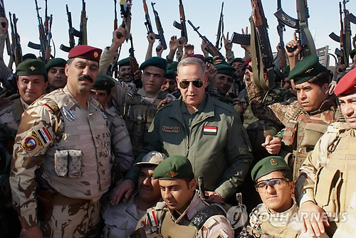 △ 이라크 국방장관, 티크리트 탈환전 사령부 방문 (AP=연합뉴스) 칼리드 알오베이디 이라크 국방장관(가운데)이 7일(현지시간) 살라후딘주 사마라의 군 사령부를 방문, 장병들과 함께 포즈를 취하고 있다. 이라크 군은 이곳에서 얼마 떨어지지 않은 살라후딘주 주도이자 사담 후세인의 고향인 티크리트를 수니파 극단주의 무장세력 '이슬람국가'(IS)로부터 탈환하기 위해 시아파 민병대와 친정부 수니파 전사의 지원 아래 대규모 군사작전을 벌이고 있다. marshal@yna.co.kr In this Saturday, March 7, 2015 photo, Iraqi Defense Minister Khalid al-Obeidi, center, surrounded by soldiers, as they pose for a group photograph at the Iraqi Army headquarters in Samarra, 60 miles (95 kilometers) north of Baghdad, Iraq. Backed by allied Shiite and Sunni fighters, Iraqi security forces on Monday began a large-scale military operation to recapture Saddam Hussein's hometown from the Islamic State extremist group, state TV said, a major step in a campaign to reclaim a large swath of territory in northern Iraq controlled by the militants. (AP Photo)