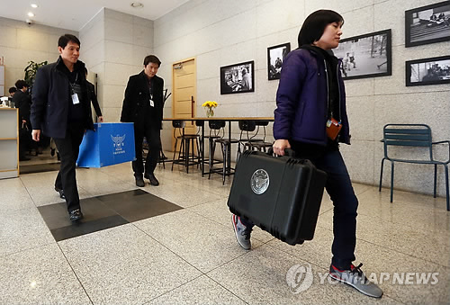 | △ 경찰, 박현정 前대표 명예훼손 관련 서울시향 압수수색 (서울=연합뉴스) 신준희 기자 = 11일 오후 박현정 전 서울시향 대표의 명예훼손 사건과 관련해 서울시향을 압수수색한 서울지방경찰청 사이버수사대가 사무실에서 압수한 물품을 들고 나오고 있다. |