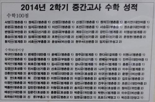 | △ 학생들의 성적과 재학 학교가 공개된 학원 게시물(사교육걱정없는세상 제공) |