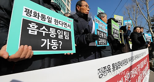 민주화를위한변호사모임과 평화와통일을여는사람들 등 7개 단체는 12일 통준위 사무실이 있는 서울 정부서울청사 창성동 별관 앞에서 기자회견을 열어 "흡수통일 기도는 남북 간 극한 대결과 남북관계 파탄을 가져온다"고 강조했다.