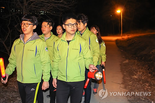 | △ "학우들 안전, 우리가 지킵니다" (경산=연합뉴스) 이강일 기자 = 대구대 학생들이 무술유단자 등으로 구성된 자율방범대를 구성해 밤 시간 학교주변 등에 대한 순찰에 나섰다. 자율방범대는 밤늦게 귀가하는 학생이 원하면 집까지 동행하는 서비스도 제공한다. 2015.3.12 <<대구대>> leeki@yna.co.kr |