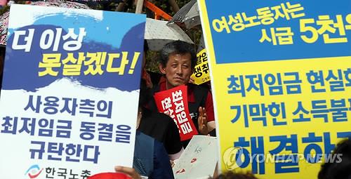 민주노총은 "우리나라의 최저임금은 제도의 취지대로 노동자의 생활안정에 기여하는 것이 아니라, 영세 사업자나 악덕 사용자가 최대한 노동력을 착취할 수 있는 수단으로 활용하고 있다"고 주장했다.