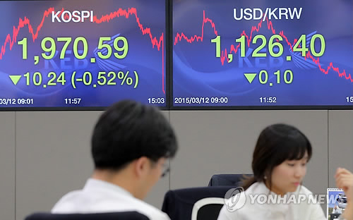 △ 코스피 나흘째 하락 (서울=연합뉴스) 이정훈 기자 = 코스피는 12일 한국은행의 기준금리 인하 결정에도 하락으로 마감했다. 이날 코스피는 전날보다 10.24포인트(0.52%) 내린 1,970.59, 원·달러 환율은 0.1원 내린 1,126.4원으로 마감했다. 사진은 이날 서울 명동 외환은행 본점 딜링룸.