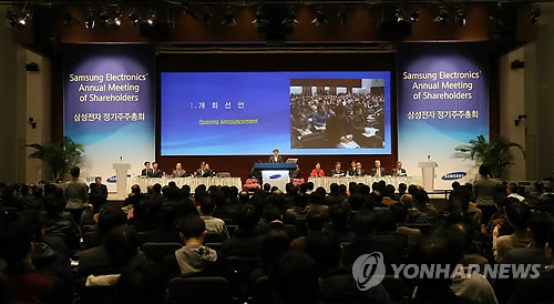 이날 주총을 연 곳은 삼성전자와 삼성전기[009150], 삼성정밀화학[004000], 삼성에스디에스[018260], 제일모직[028260] 등 삼성 계열과 현대차, 현대모비스[012330], 현대건설[000720] 등 현대차 계열, LG디스플레이[034220]와 LG상사[001120] 등 LG[003550] 계열 등 68곳이다.