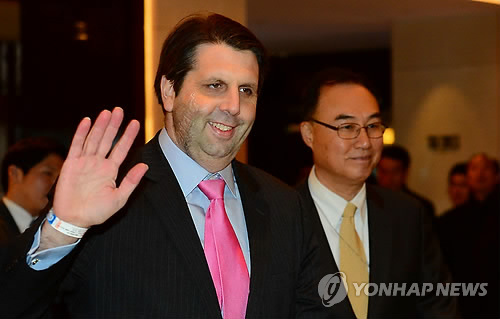 | △ 주한미군 초청 만찬 참석한 리퍼트 대사 (서울=연합뉴스) 최재구 기자 = 마크 리퍼트 주한 미국대사가 13일 오후 피습 사건 이후 첫 공식 행사로 서울 소공동 조선호텔에서 열린 주한미군초청만찬에 참석하며 취재진을 향해 손을 흔들고 있다. 2015.3.13 jjaeck9@yna.co.kr |