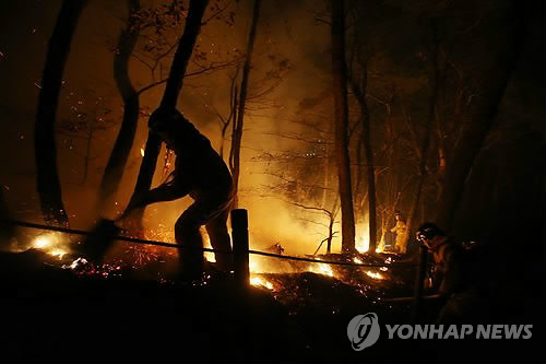 | △ 14일 새벽 서울 노원구 불암산에서 소방관들이 진화작업을 벌이고 있다. 전날 오후 10시 59분께 불암산 중턱 학도암 부근에서 발생한 화재는 정상 방향으로 옮겨 붙고 있어 소방 당국은 장비 20여대와 인원 100여명을 동원해 진화 중이다. |
