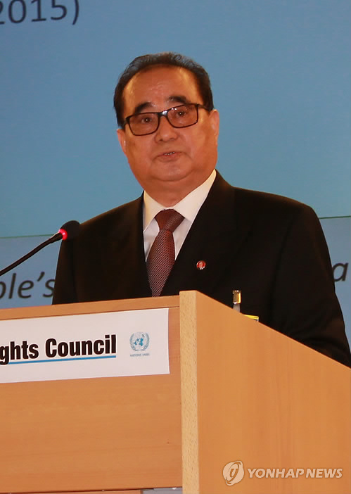 | △ 기조연설하는 북한 리수용 외무상 (제네바=연합뉴스) 류현성 특파원 = 남북이 3일(현지시간) 스위스 제네바 유럽 유엔본부에서 열린 제28차 유엔 인권이사회에서 북한 인권문제를 둘러싸고 격돌했다. 사진은 북한 리수용 외무상이 유엔 인권이사회에서 기조연설하는 모습. 2015.3.4 rhew@yna.co.kr |
