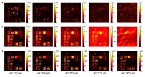 | △ 생체 조직 모형의 이용한 CASS 현미경 성능 실험. 테스트 표적(금 입자) 위에 다양한 두께의 생체 조직 모형(산란매질)을 올려 놓은 뒤 CASS 광학현미경으로 얻은 영상. (a) 일정 시점에 반사돼 나온 빛만 모아 만든 시분해 영상. 산란 매질이 160㎛(0.16㎜) 일 때도제대로 된 영상을 얻을 수 없다. (b) 다양한 입사각을 통해 얻은 시분해 영상을 합친 것. 산란매질 두께가 0.65㎜일 때까지는 흐릿한 영상을 얻을 수 있지만 더 두꺼워지면 해상도가 급격히 떨어진다. (c) CASS 광학현미경을 통해 얻은 영상. 산란매질 두께가 1.15mm 일 때도 0.16㎜일 때와 비슷한 해상도를 얻을 수 있다. |