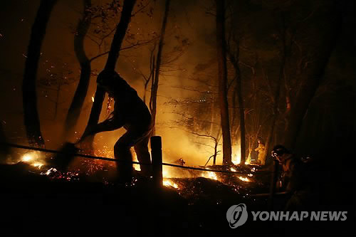 | △ 불암산 산불 진화하는 소방관 (서울=연합뉴스) 김주성 기자 = 14일 새벽 서울 노원구 불암산에서 소방관들이 산불 진화작업을 벌이고 있다. 전날 오후 10시 59분께 불암산 중턱 학도암 부근에서 발생한 화재는 정상 방향으로 옮겨 붙고 있어 소방 당국은 장비 20여대와 인원 100여명을 동원해 진화 중이다. 2015.3.14 utzza@yna.co.kr |
