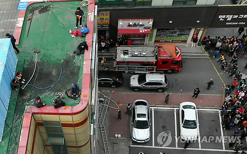 옥상으로 대피한 일부는 소방당국이 지상에 설치한 에어매트로 뛰어 내렸다.