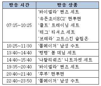 이날 방송에서는 최유돈 디자이너의 브랜드 '유돈초이EC2'의 맨투맨 티셔츠, 프랑스 캐주얼 브랜드 '큘트'의 운동복, 캐주얼 브랜드 '태그'의 티셔츠 세트 등을 선보인다.