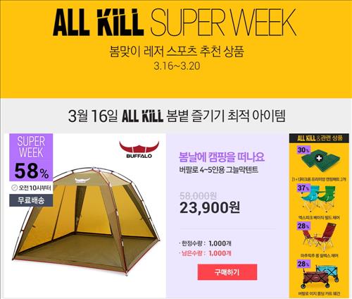 매일 오전 10시 일일특가 코너에서 ▲ 16일 버팔로 스크린 쉐이드 220 그늘막 텐트(2만3천900원) ▲ 17일 KAPPA 백팩 9천900원 ▲ 18일 삼천리 크래프트 MTB 자전거(9만9천900원) ▲ 19일 아디다스 운동화(5만9천800원) ▲ 20일 코베아 오페라블랙 텐트(79만9천원) 등을 선보인다.