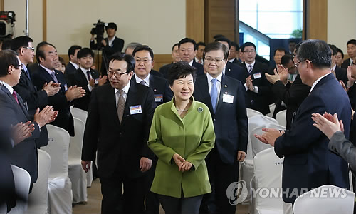 | △ 부산창조경제혁신센터 출범식 (부산=연합뉴스) 도광환 기자 = 박근혜 대통령이 16일 오전 부산 벡스코에서 열린 부산창조경제혁신센터 출범식에 참석, 서병수 부산시장, 조홍근 센터장, 신동빈 롯데그룹 회장, 최양희 미래창조과학부 장관 등과 함께 출범식장에 입장하고 있다. |