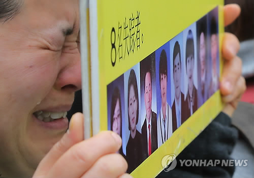 | △ 마르지 않는 눈물 (서울=연합뉴스) 이정훈 기자 = 세월호 참사 1주기를 앞두고 17일 오전 서울 종로구 청운효자동주민센터 앞에서 4.16 세월호 가족협의회와 세월호 참사 국민대책회의 주최로 열린 세월호 인양촉구 대국민 호소 기자회견에서 한 실종자 가족이 눈물을 흘리고 있다. |