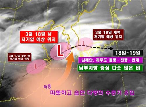 기상청은 남서쪽에서 다가오는 저기압의 영향으로 17일 밤 전남 해안과 제주도에서 비가 시작돼 18일 전국으로 확대되겠다고 예보했다.