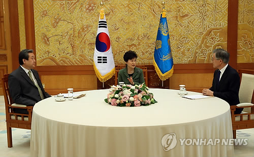 | △ 대화하는 박 대통령과 여야 대표 (서울=연합뉴스) 도광환 기자 = 박근혜 대통령과 새누리당 김무성 대표, 새정치민주연합 문재인 대표가 17일 오후 청와대에서 열린 여야대표 회동에서 대화하고 있다. dohh@yna.co.kr |