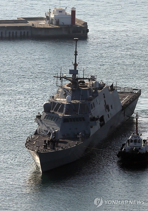 △ 미 연안 전투함 포트워스함 입항 (부산=연합뉴스) 조정호 기자 = 독수리훈련에 참가한 미 해군의 연안전투함(LCS)인 포트워스함(3천t)이 14일 해군작전사령부 부산기지에 입항하고 있다. LCS는 항공기의 제트 엔진처럼 엔진과 연결된 펌프를 돌려 배 밑바닥의 흡입구로 물을 빨아들이는 제트 엔진 추진 장치로 움직인다. 얕은 해저 지형에서 자유롭게 작전을 펼 수 있다. 이 함정에는 100여 명의 장병이 승선하고 MH-60R 시호크 헬기와 MQ-8B 파이어 스카우트 무인헬기를 탑재하고 있다. 2015.3.14 ccho@yna.co.kr