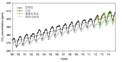 최근 10년간(2005∼2014년) 이산화탄소 연평균 농도 증가율은 2.09ppm(Parts per million: 백만분의 일)이었다. 지구의 연평균 농도(2004∼2013년) 증가율 2.07ppm과 비슷한 수치다.