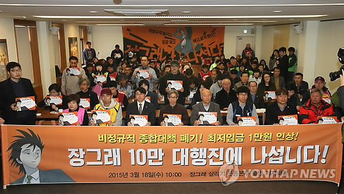 | △ '장그래 살리기 운동본부' 출범 (서울=연합뉴스) 박지호 기자 = 18일 오전 서울 정동 프란치스코회관에서 '장그래 살리기 운동본부 출범 기자회견'이 진행되고 있다. 2015.3.18 jihopark@yna.co.kr |