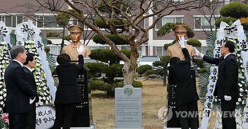 | △ 천안함 용사 故 심영빈·장진선 중사 흉상 제막식 (동해=연합뉴스) 유형재 기자 = 제5주기 천안함 용사 추모행사를 일주일 앞둔 18일 천안함 46용사인 고(故) 심영빈·장진선 중사의 흉상 제막식이 모교인 강원도 동해시 광희고등학교에서 거행됐다. 광희고 및 광희고 총동문회, 해군 1함대 공동 주관으로 열린 이번 행사는 두 용사의 유가족과 정안호 1함대사령관을 비롯한 해군 지휘관과 장병, 조용근 천안함 재단 이사장, 천안함 유족회 박병규 대표 등이 참석했다. 두 중사는 2010년 3월 26일 백령도 서남방에서 서해 북방한계선(NL)L 수호 임무수행 중 북한 잠수정의 기습적인 어뢰공격으로 44명의 전우와 함께 산화했다.2015.3.18 yoo21@yna.co.kr |