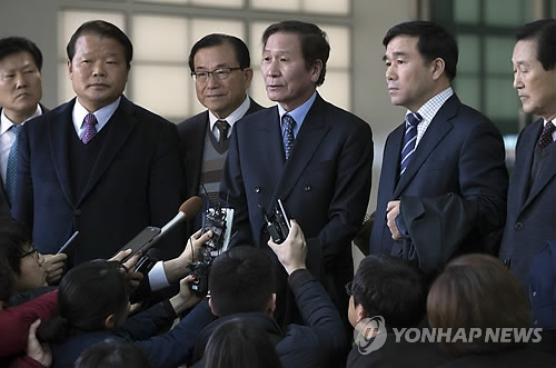 | △ 질문에 답하는 개성공단 입주기업 대표단 (파주=연합뉴스) 윤동진 기자 = 북한이 남북 당국간 협의를 거쳐 노동규정이 개정돼야 한다는 등의 내용을 담은 건의문 접수를 거부한 것으로 전해진 가운데 18일 오후 경기 파주시 경의선 남북출입사무소에서 정기섭 개성공단기업협회장을 비롯한 입주기업 대표단이 입경한 후 취재진의 질문에 답하고 있다. 2015.3.18 mon@yna.co.kr |