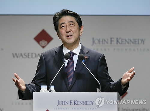 | △ 18일 와세다대에서 연설하는 아베 총리(EPA.연합뉴스) |