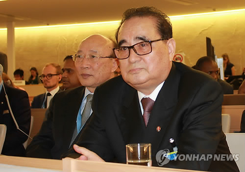 | △ 북한 리수용 외무상이 지난 3일 스위스 제네바에서 열린 유엔 인권이사회에서 기조연설을 앞두고 자리에 앉아 있다. 리 외무성은 이 연설에서 유엔 인권결의안의 기초가 된 탈북자 신동혁씨의 주장이 거짓으로 드러나 인권결의안도 무효가 됐다고 주장했다. <<연합뉴스DB>> |